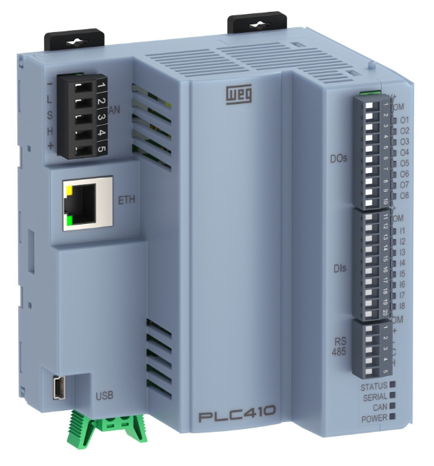 El controlador lógico programable PLC410 es el PLC más nuevo en la familia de controladores WEG. Desarrollado para tener un beneficio de costo por encima del promedio,