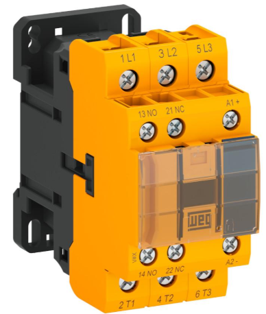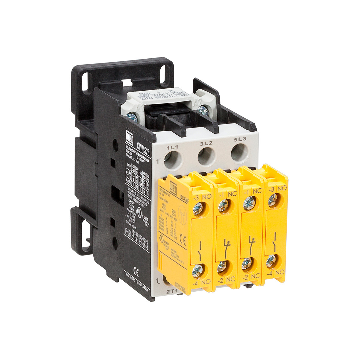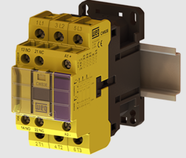 Contactores de potencia CWMS (9A a 105A @ AC-3) y contactores auxiliares CAWMS utilizados en sistemas de seguridad de máquinas y equipos.